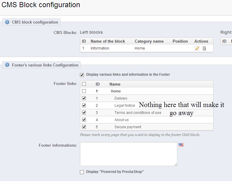 brucedevries Posted October 9, 2013 Share Posted October 9, 2013 I do not have a physical store and it has been a real pain to remove all of the references! I have removed it from the CMS block on the left side and in the Admin area Preference display in Footer is off. Yet it still displays. Attached is what i am talking about in case there is any doubt. The CMS appears to only be for the left block, but showing it anyway. last image shows no check box for our store. Unchecking display various links and information in the footer removes the entire block.. How do I get rid of this last reference to "Our Stores"? Thank you. Yes, there are other posts , but no answers that have worked for me. Link to comment Share on other sites More sharing options...