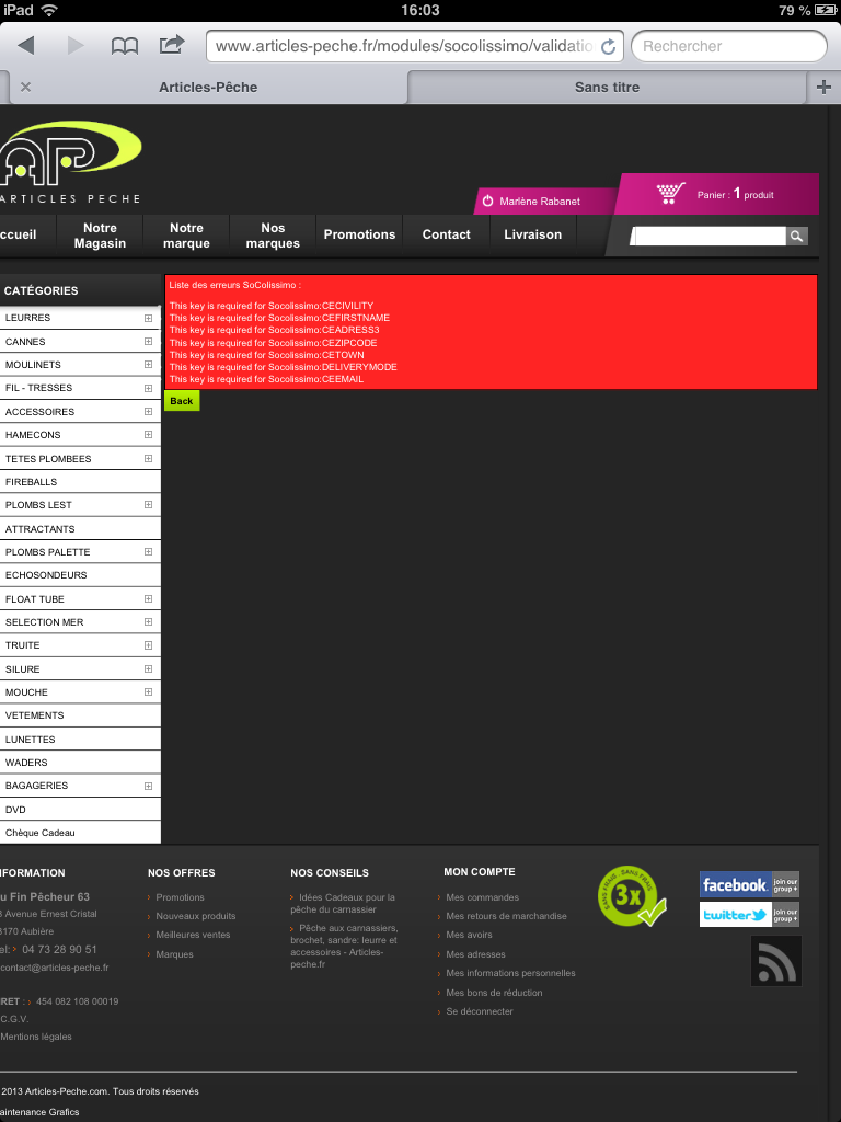 vanessa3itech Posted August 3, 2015 Share Posted August 3, 2015 (edited) Bonjour, La fancybox s'ouvre bien après avoir choisi le tranporteur colissimo mais au lieu d'afficher les choix de livraison, j'ai le message suivant : "Suite à un incident technique, vous ne pouvez pas finaliser votre commande.Merci de réessayer ultérieurement ou d'alerter le service clients du site.Par avance veuillez nous excuser pour le désagrément subi." Comment y remédier, quel peut être le problème? Merci Vanessa Edited August 3, 2015 by vanessa3itech (see edit history) Link to comment Share on other sites More sharing options...