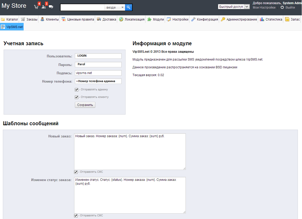 kompua Posted October 10, 2013 Share Posted October 10, 2013 Предлагаем Вашему вниманию Бесплатный модуль СМС уведомлений "VipSMS.net для PrestaShop" 1 Очень легко устанавливается 2 Работает поддержка и обновление модуля 3 Все это совершенно бесплатно Функционал 1 Для клиента интернет магазина Модуль отправляет СМС сообщение при поступлении заказа Модуль отправляет SMS уведомление при изменении статуса заказа Вместо номера отправителя в СМС будет приходить название интернет магазина Рассылка СМС поддерживается на Всех мобильных операторов Украины и России 2 Для Администратора Модуль VipSMS (опционально) отправляет СМС на номер указанный как номер админа сайта Есть возможность изменить текст шаблона СМС сообщений Подробный отчет о доставленных сообщениях И многое другое. Подробное описание и самую последнюю версию модуля Вы всегда сможете скачать здесь http://vipsms.net/api/extensions/prestashop.html vipsms_mod-presta-v0002 (2).zip Link to comment Share on other sites More sharing options...