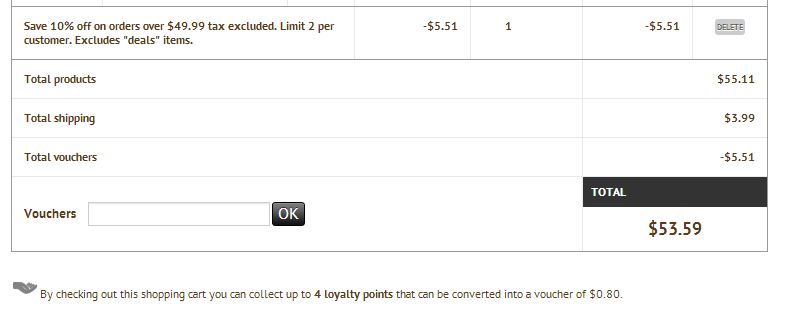 misu3108 Posted October 11, 2013 Share Posted October 11, 2013 Hi , I noticed a problem in cart in the new 1.5.6 version. I added 3 products 3 x $18.37 = $55.11 then I added a 10% discount = -$5.11 and with flat rate shipping = $3.99 TOTAL = $53.59 NOT $53.99 Here's the attached cart: Thanks Link to comment Share on other sites More sharing options...