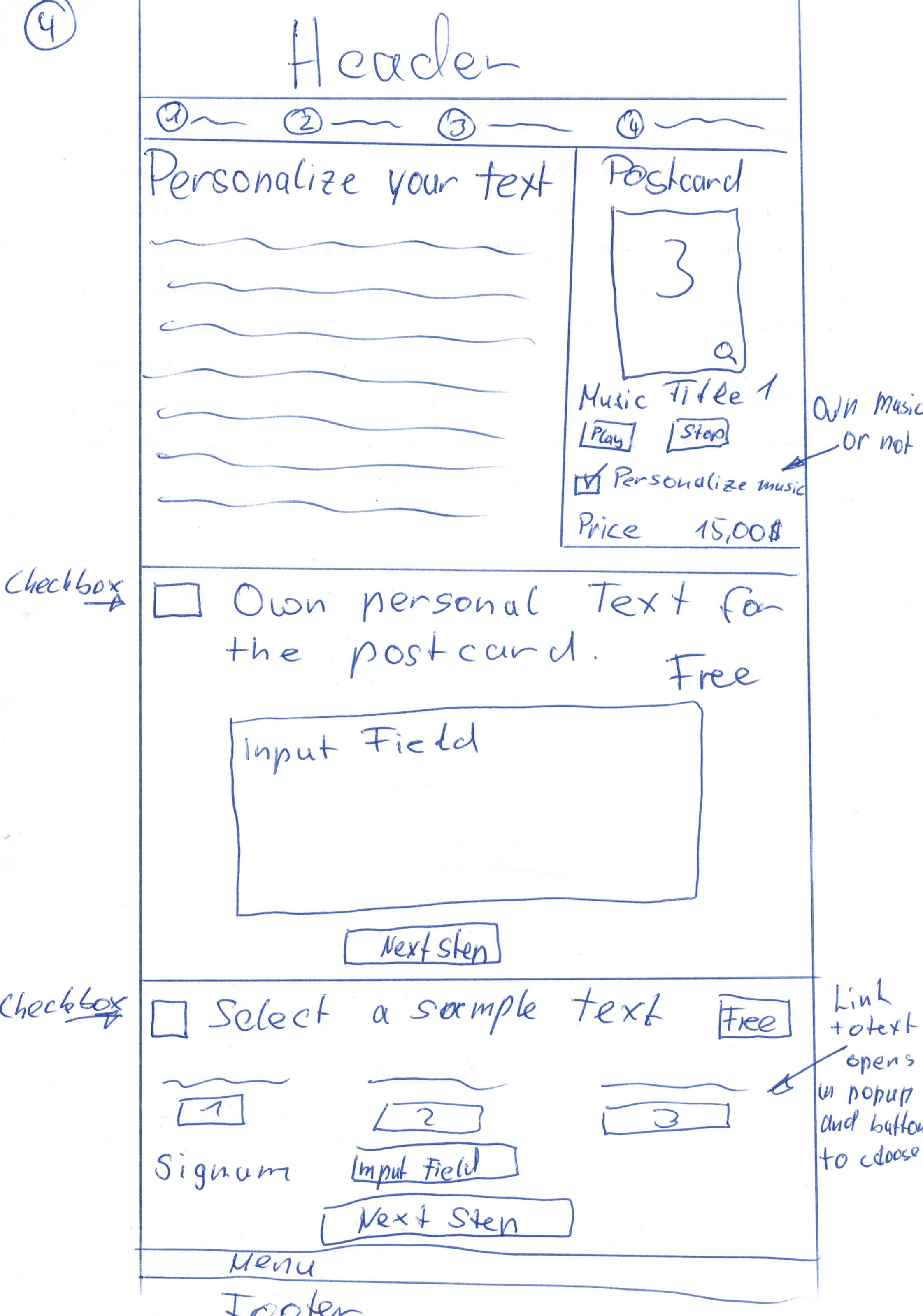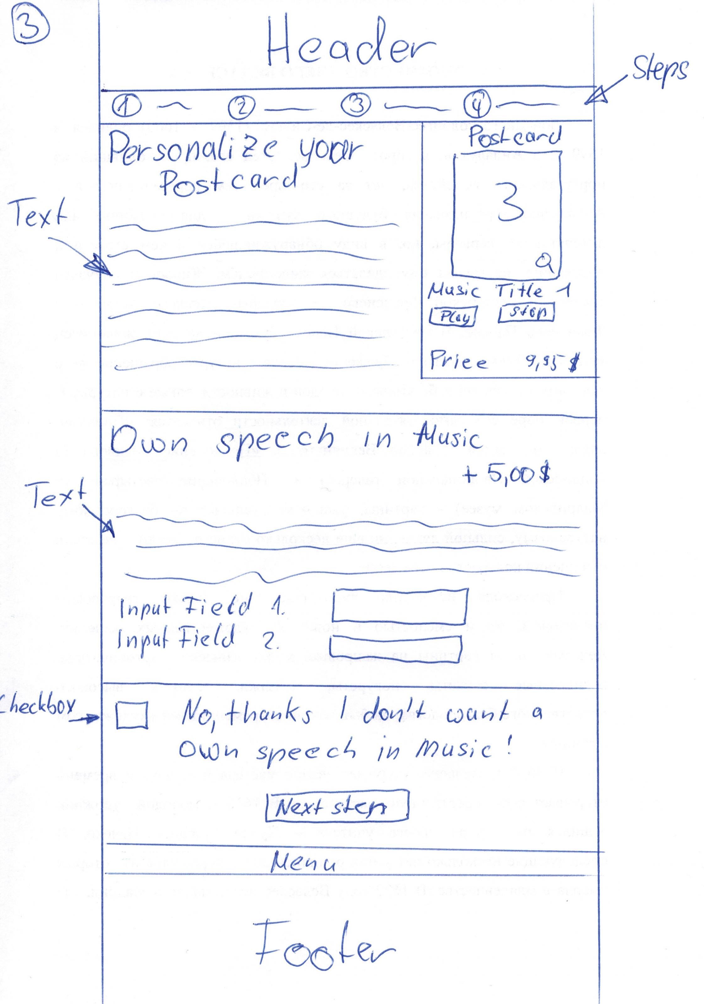 rectox Posted October 11, 2013 Share Posted October 11, 2013 Hello! We need to modificate prestashop with new function. What is our idea?We want to sell costumizable products on a landingpage.So how it must look?Please look on the images what i upload. There you will seeall steps how the site must look.1. Landing pageOn the first site must be list of products. Under each producta button to choose this product.... after a person put this product in the basket he need comes to the next step.STEP 1.Here will see the person a little text and in the right a pictureof the product what they have choosen. Under this information will besome music sample what he can listen and choose one.STEP 2.After the user choose a music he comes to a page where he can writea text or check a checkbox and dont write a own text. This must bea paid option if he will write a text.STEP 3.Here he can again write a own text or he must choose one of our text.This option can be free and paid.STEP 4.On this page he will enter his adress, a delivery adress, choose apayment methods (we will give the payment modules)STEP 5.Here the costumer will see a order review after he click the button"place the order" he will redirect to the payment page. Link to comment Share on other sites More sharing options...