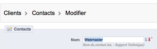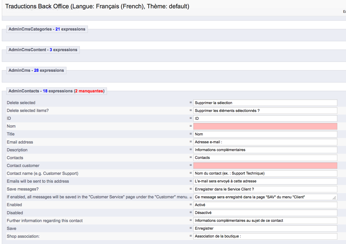 indesign47 Posted October 11, 2013 Share Posted October 11, 2013 Ce qui manque la traduction des labels des champs cela doit être dans le BO mais ou ?? Remplace $this->fields_list = array( 'id_contact' => array('title' => $this->l('ID'), 'align' => 'center', 'width' => 25), 'name' => array('title' => $this->l('Title'), 'width' => 130), 'first_name' => array('title' => $this->l('Title'), 'width' => 130), 'address' => array('title' => $this->l('Title'), 'width' => 130), 'city' => array('title' => $this->l('Title'), 'width' => 130), 'postal_code' => array('title' => $this->l('Title'), 'width' => 130), 'email' => array('title' => $this->l('Email address'), 'width' => 130), 'description' => array('title' => $this->l('Description'), 'width' => 150), ); Par $this->fields_list = array( 'id_contact' => array('title' => $this->l('ID'), 'align' => 'center', 'width' => 25), 'name' => array('title' => $this->l('Name'), 'width' => 130), 'first_name' => array('title' => $this->l('First name'), 'width' => 130), 'address' => array('title' => $this->l('Adress'), 'width' => 130), 'city' => array('title' => $this->l('City'), 'width' => 130), 'postal_code' => array('title' => $this->l('Postal code'), 'width' => 130), 'email' => array('title' => $this->l('Email address'), 'width' => 130), 'description' => array('title' => $this->l('Description'), 'width' => 150), ); et la modification du fichier ContactController.php (dossier prestashop/controllers/front) C'est la partie la plus difficile en effet Link to comment Share on other sites More sharing options...