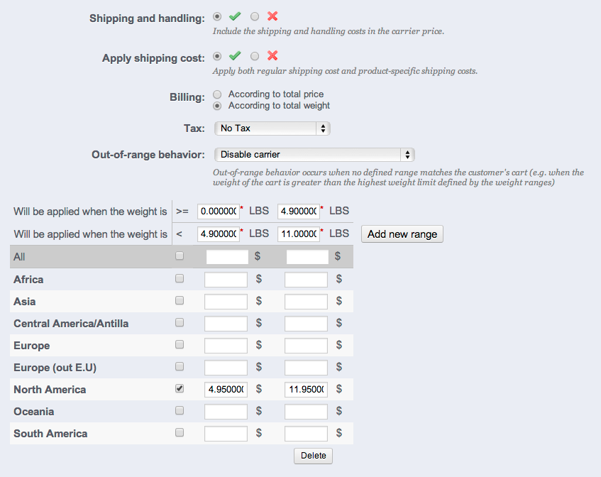 lari Posted October 12, 2013 Share Posted October 12, 2013 (edited) I am using Prestashop 1.5.6 I have one product and I have set up two shipping ranges. When I go to checkout, the shipping charges indicated are always the lowest range even when they should fall in the second range. I am not able to set up my product to ship by pound because it will only do the lowest range. Here are my settings. Please help. Edited November 8, 2013 by lari (see edit history) Link to comment Share on other sites More sharing options...