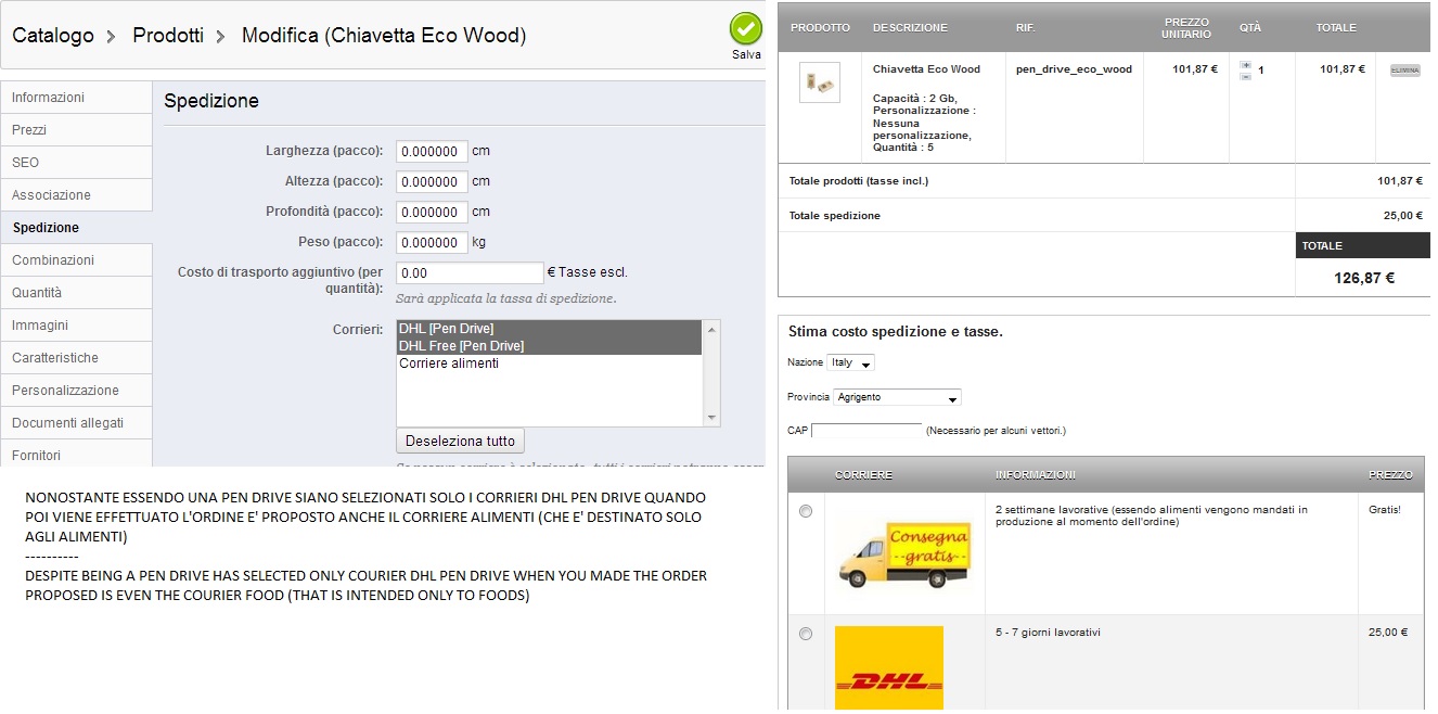 astolf Posted October 12, 2013 Share Posted October 12, 2013 In my shop I have products in various categories, in particular there are foods and non-foods. Foods have a courier service dedicated only to them, the other a courier generic. Inside the food products I have selected only the carrier food, non-food inside I set rules (above 2500 € free shipping, cost under € 2,500 25 €). Despite this when choosing a food product is also proposed for the courier items (non-food). When you choose a non-food product (eg usb pen drive) is also offered the courier foods. Enclosed is a picture. thanks The site is http://bestpromotion.comprasubito.eu Link to comment Share on other sites More sharing options...