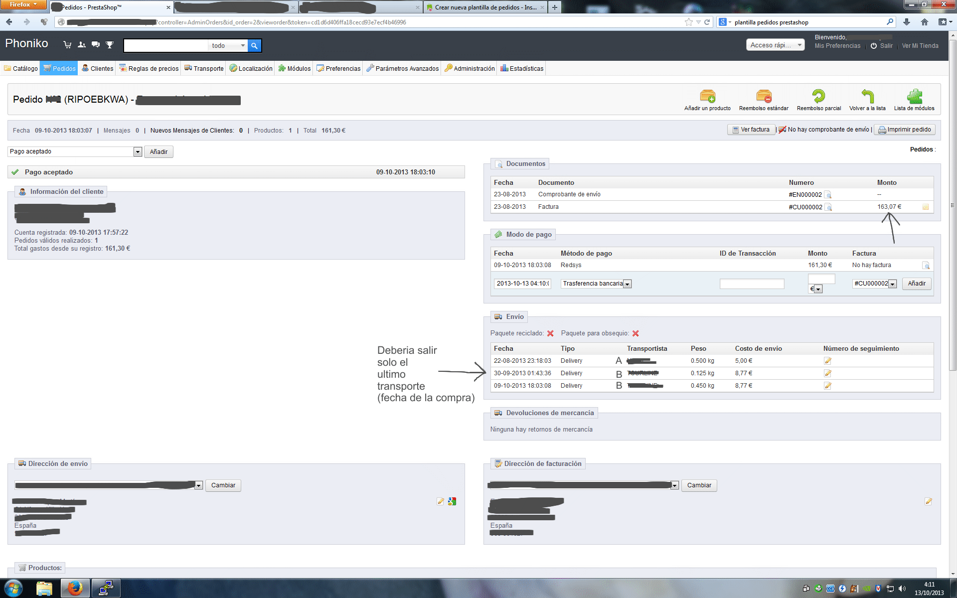 JJH Posted October 13, 2013 Share Posted October 13, 2013 (edited) Buenas a todos, el otro día se vendio un articulo en nuestra recien estrenada tienda y al acceder a la pagina / ficha de pedidos vemos que calcula mal el total del pedido. A alguien mas le ha sucedido? Problemas: 1.- Coge mal la base del importe 2.- Suma un transporte que no corresponde con la fecha del pedido 3.- Genera mal la factura. Que tpl son los que hay que tocar? (factura y pantalla pedido) Adjunto una captura de pantalla donde lo indico mas claramente. Gracias por la ayuda. Nota: la plantilla es compatible 1.5.X y la version PS que se está usando es 1.5.5 Edited October 13, 2013 by JJH (see edit history) Link to comment Share on other sites More sharing options...