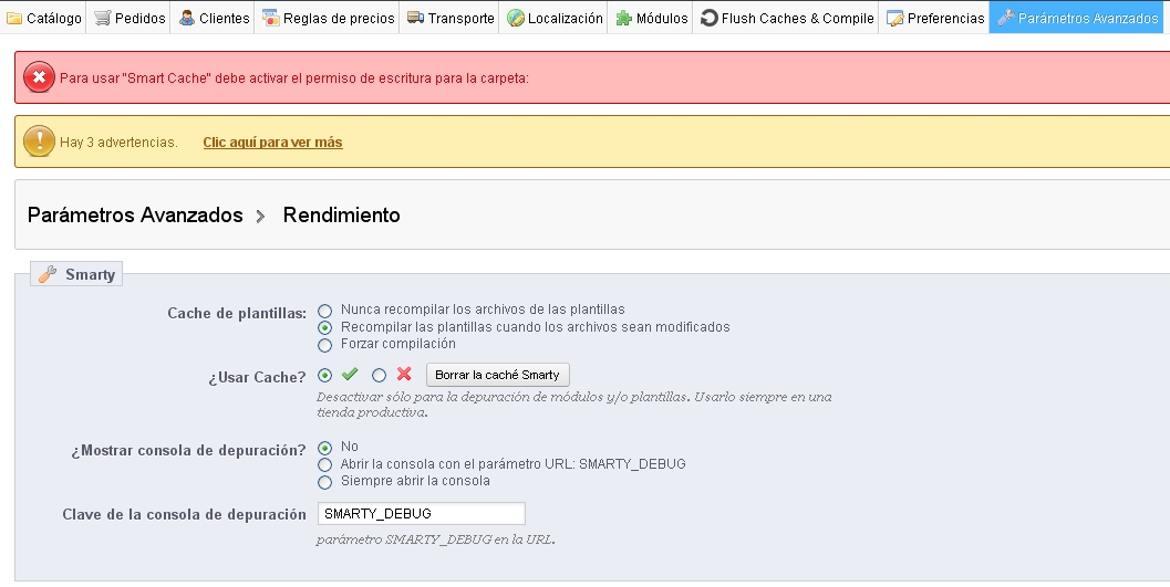 "Para usar "Smart Cache" debe activar el permiso de escritura para la carpeta:"