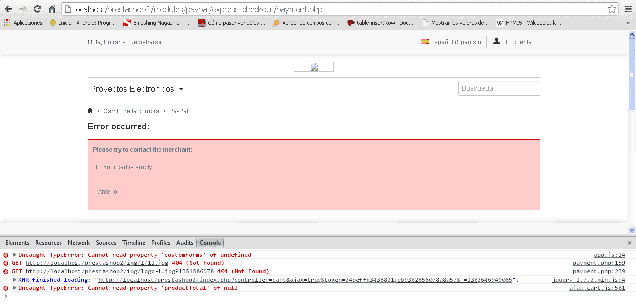 joeray Posted October 16, 2013 Share Posted October 16, 2013 (edited) Hola tengo instalado prestashop 1.5.5 y estoy intentando que funcione el módulo de paypal pero no hay manera. He configurado correctamente las claves de paypal de la empresa pero me pone que el carro está vacío al clicar en el boton de compra de paypal al querer adquirir un producto.Adjunto captura de pantalla con detalle también de la consola de errores java. Gracias Edited October 17, 2013 by joeray (see edit history) Link to comment Share on other sites More sharing options...