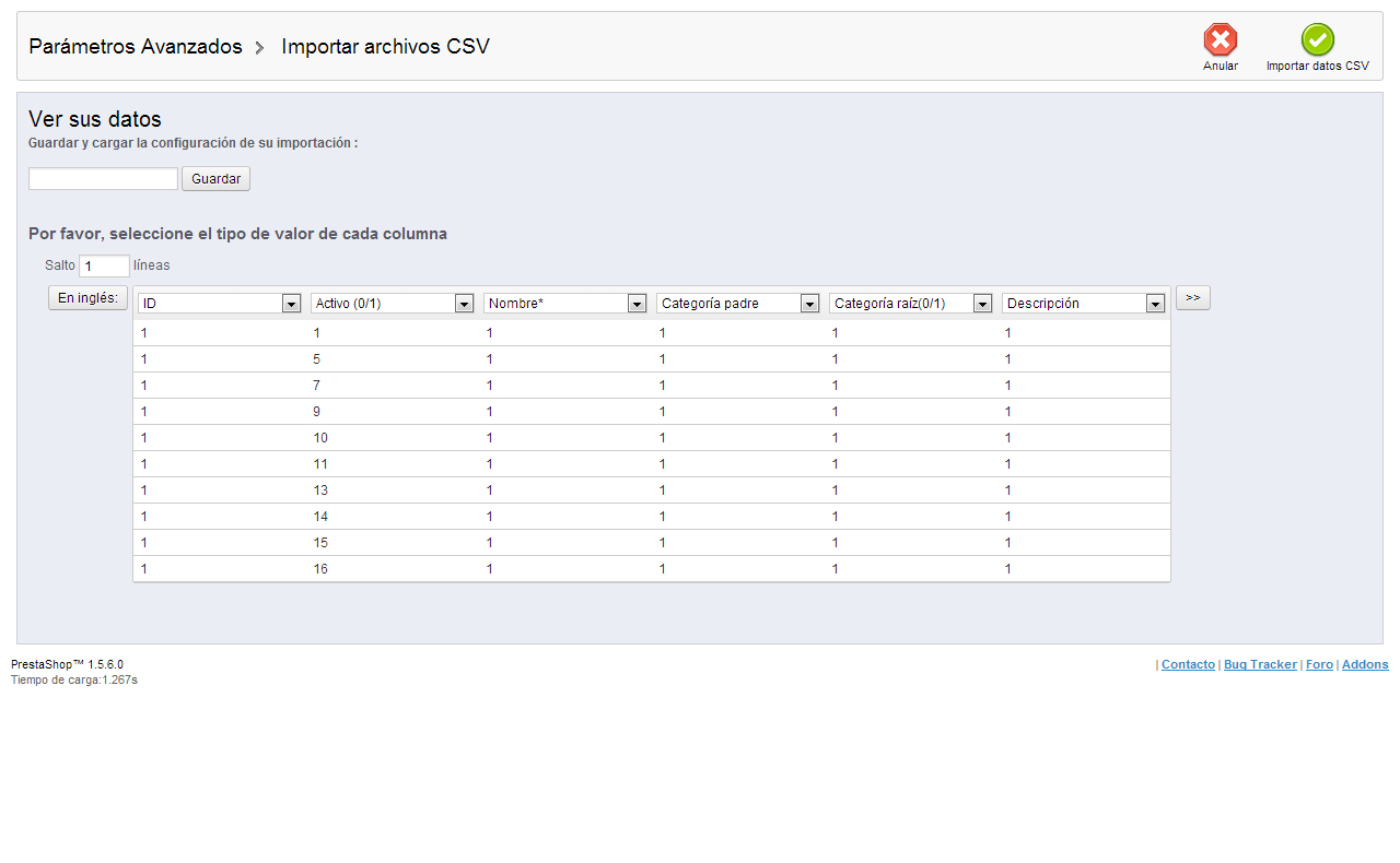 (solucionado) No aparece las columnas tabla cvs al importar - Prestashop 1.5.6