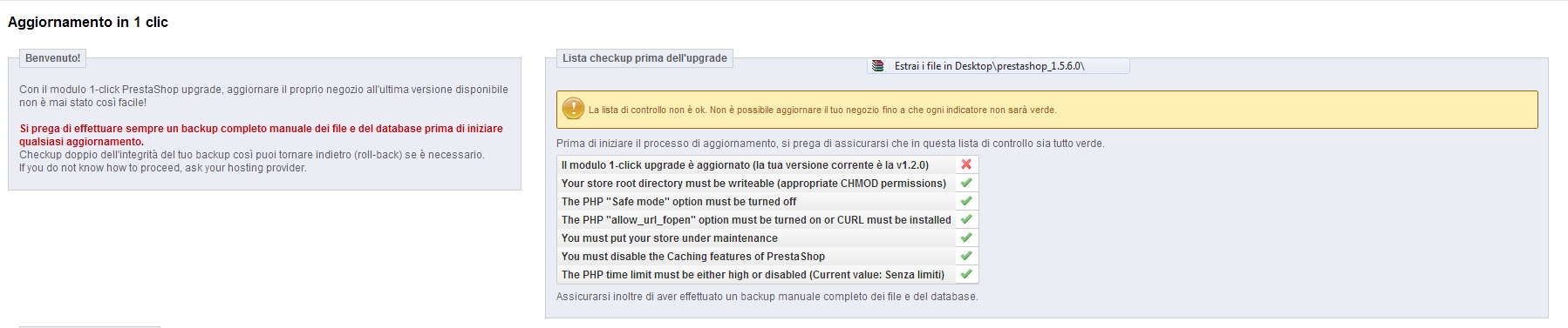 stefa38 Posted October 21, 2013 Share Posted October 21, 2013 pare che 1 click upgrade non sia aggiornato all'utima versione disinstallalo e installa l'ultima http://addons.prestashop.com/en/administration-tools-prestashop-modules/5496-1-click-upgrade-autoupgrade.html 1 Link to comment Share on other sites More sharing options...