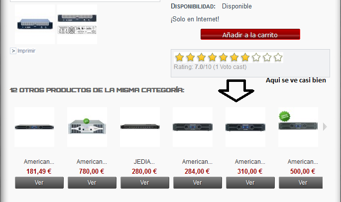 JavierP Posted October 22, 2013 Author Share Posted October 22, 2013 Contenido Productscategory.tpl del tema en modules. {if count($categoryProducts) > 0} <h2 class="productscategory_h2">{$categoryProducts|@count} {l s='other products in the same category:' mod='productscategory'}</h2> <div id="{if count($categoryProducts) > 5}productscategory{else}productscategory_noscroll{/if}"> {if count($categoryProducts) > 5}<a id="productscategory_scroll_left" title="{l s='Previous' mod='productscategory'}" href="javascript:{ldelim}{rdelim}">{l s='Previous' mod='productscategory'}</a>{/if} <div id="productscategory_list"> <ul {if count($categoryProducts) > 5}style="width: {math equation="width * nbImages" width=107 nbImages=$categoryProducts|@count}px"{/if}> {foreach from=$categoryProducts item='categoryProduct' name=categoryProduct} <li {if count($categoryProducts) < 6}style="width: {math equation="width / nbImages" width=94 nbImages=$categoryProducts|@count}%"{/if}> <a href="{$link->getProductLink($categoryProduct.id_product, $categoryProduct.link_rewrite, $categoryProduct.category, $categoryProduct.ean13)}" title="{$categoryProduct.name|htmlspecialchars}"><img src="{$link->getImageLink($categoryProduct.link_rewrite, $categoryProduct.id_image, 'medium')}" alt="{$categoryProduct.name|htmlspecialchars}" /></a><br/> <a href="{$link->getProductLink($categoryProduct.id_product, $categoryProduct.link_rewrite, $categoryProduct.category, $categoryProduct.ean13)}" title="{$categoryProduct.name|htmlspecialchars}"> {$categoryProduct.name|truncate:15:'...'|escape:'htmlall':'UTF-8'} </a><br /> {if $ProdDisplayPrice AND $categoryProduct.show_price == 1 AND !isset($restricted_country_mode) AND !$PS_CATALOG_MODE} <span class="price_display"> <span class="price">{convertPrice price=$categoryProduct.displayed_price}</span> </span><br /> {else} <br /> {/if} <a title="{l s='View' mod='productscategory'}" href="{$link->getProductLink($categoryProduct.id_product, $categoryProduct.link_rewrite, $categoryProduct.category, $categoryProduct.ean13)}" class="front_see cfloat width96 button_small">{l s='View' mod='productscategory'}</a><br /> </li> {/foreach} </ul> </div> {if count($categoryProducts) > 5}<a id="productscategory_scroll_right" title="{l s='Next' mod='productscategory'}" href="javascript:{ldelim}{rdelim}">{l s='Next' mod='productscategory'}</a>{/if} </div> <br class="clear" /> <br /> <script type="text/javascript"> $('#productscategory_list').trigger('goto', [{$middlePosition}-3]); </script> {/if} Link to comment Share on other sites More sharing options...