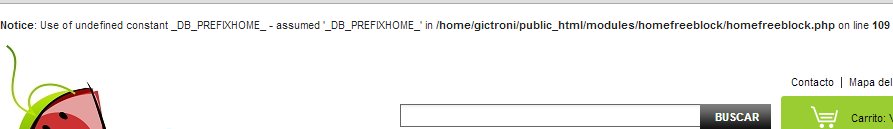 nadie Posted October 23, 2013 Share Posted October 23, 2013 Bueno ya deje todo como estaba antes y se corrigo la página solo agregue los comandos que me sugeriste y siguio apareciendo esto: Notice: Use of undefined constant _DB_PREFIXHOME_ - assumed '_DB_PREFIXHOME_' in /home/gictroni/public_html/modules/homefreeblock/homefreeblock.php on line 109 Que significa? Esa linea que comentas es por el modulo http://addons.prestashop.com/en/front-office-features-prestashop-modules/965-modified-free-home-block.html En realidad no es un error, es mas un warning homefreeblock lo puedes desinstalar en la pestaña modulos -> modulos No se que haces usando ese modulo antiguo, cuando puedes usar contentbox http://contentbox.org/ xDDDDD Pero vamos, ese modulo no tiene nada que ver con que tu pagina se caiga. ¿Has investigado en el log de errores de tu hosting? Link to comment Share on other sites More sharing options...