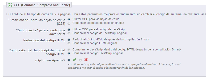 moraira Posted October 23, 2013 Share Posted October 23, 2013 Hola Mary, puedes subir un poco la memoria de Prestashop, se puede hacer en php.ini pero mejor si lo haces en el fichero de configuracion, en config.inc /* Improve PHP configuration to prevent issues */ ini_set('upload_max_filesize', '100M'); ini_set('default_charset', 'utf-8'); ini_set('magic_quotes_runtime', 0); /* correct Apache charset (except if it's too late */ if (!headers_sent()) header('Content-Type: text/html; charset=utf-8'); e inserta este par de lineas /* Improve PHP configuration to prevent issues */ ini_set('upload_max_filesize', '100M'); ini_set('default_charset', 'utf-8'); ini_set('magic_quotes_runtime', 0); ini_set('memory_limit','256M'); ini_set('display_errors','on'); /* correct Apache charset (except if it's too late */ if (!headers_sent()) header('Content-Type: text/html; charset=utf-8'); Luego en el apartado rendimiento, asegúrate que usas cache y no tienes marcada la compilación en el primer apartado, y en el ccc que esté como el fichero que te adjunto. El apartado Java (la 4ª opción de ccc) puedes compactarla también, nosotros ahora lo teníamos descomprimido para hacer algún que otro chequeo. Nosotros por aumento de prestaciones y tenemos compactado tambien globall.css, lo hacemos con alguna herramienta como esta: http://herramientas-online.com/comprimir-descomprimir-css.html aunque tampoco mejora muchisimo se reduce 1/3 (recomendable guardar una versión sin comprimir, para futuras modificaciones, que si no tendrás que descomprimirlo siempre antes) PERO SIN DUDA, si con todo esto no mejoras, es tema de subir de categoría en lo que a servidor se refiere. A título de curiosidad te diré que empezamos con un servidor compartido, más bien modesto, y no podíamos subir fotos de más de 100kb, ahora no miramos la longitud, pero 500kb y van como un tiro. ya nos contarás Link to comment Share on other sites More sharing options...