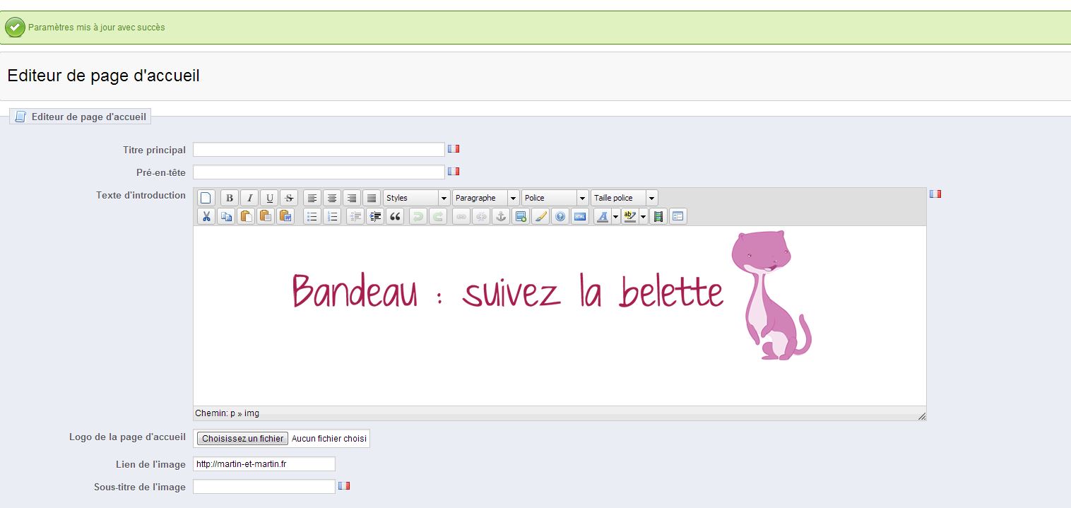 Eva Martin Posted October 23, 2013 Share Posted October 23, 2013 Bonjour bonjour ! Premier sujet, donc forcément : question de débutante, mais désolée je n'arrive pas à trouver d'information simple pour solutionner mon souci : Je souhaite ajouter un bloc image tout bête dans mon thème Prestashop. Je ne me suis pas du tout impliquée dans la conception des thèmes et j'ai préféré en acheter un tout fait, par souci de simplicité, car je ne programme pas et tout ça était assez effrayant a vrai dire ... Etant donné tout ce que propose Prestashop comme modules, je suis sure qu'il y a, quelque part, le module qu'il me faut, mais je tourne en rond sans le trouver. J'ai tenté de lancer le module "éditeur de page d'accueil", et d'y insérer mon image, mais : - une image d'IPhones (probablement issue du modèle initial Prestashop) s'affiche avant la mienne, je ne trouve pas comment la supprimer - un message d'erreur s'affiche comme quoi la syntaxe du module éditeur de page d'accueil n'est pas bonne, et le module n'a pu être chargé. Cependant, mon image (ainsi que celle des Iphone) s'affiche tout de même sur le site. A toute personne qui aura la bonté d'éclaircir ma lanterne, merci d'avance Link to comment Share on other sites More sharing options...