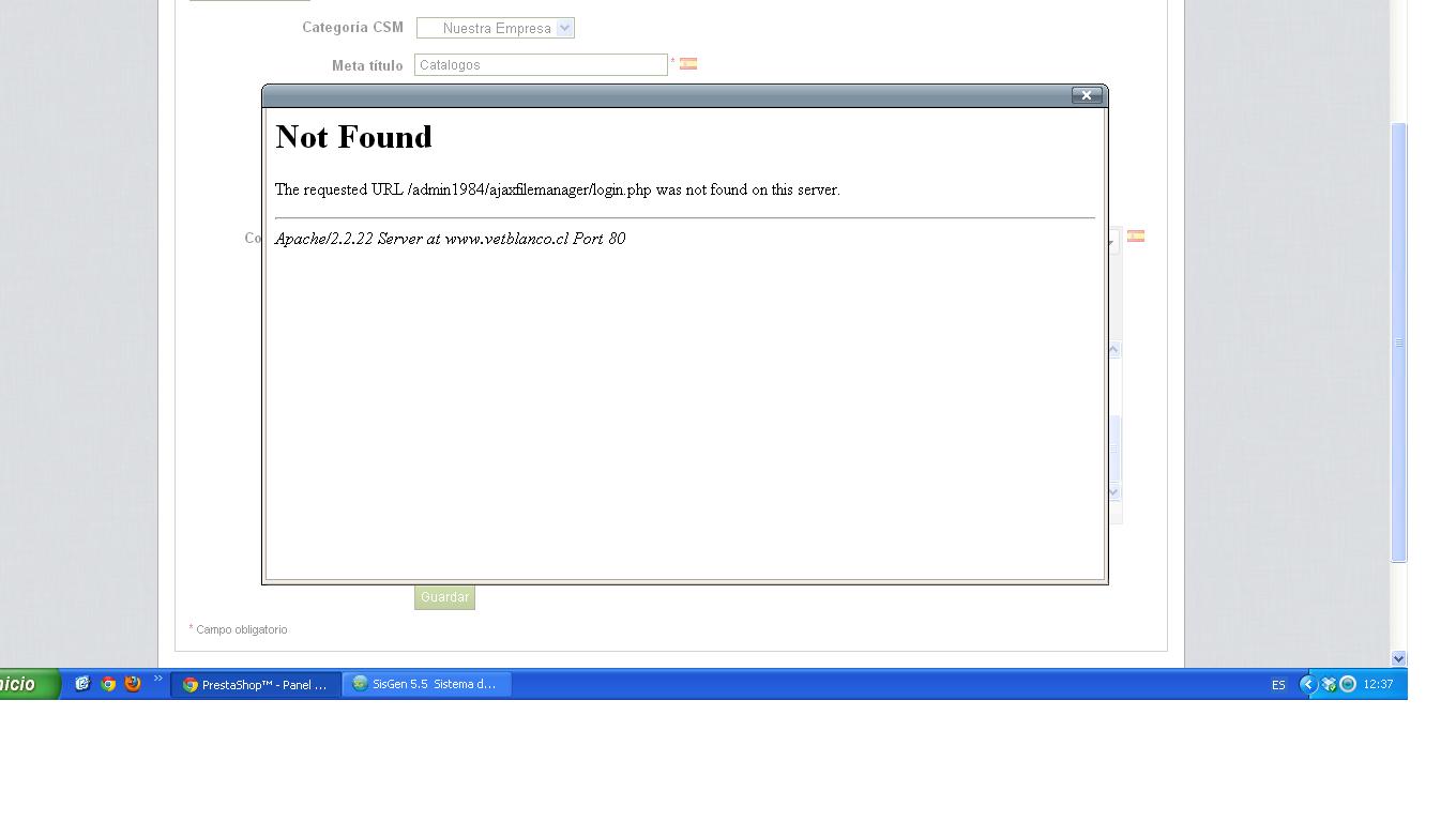http://www.prestashop.com/forums/topic/111018-uploadedit-image-tinymce-not-found-the-requested-urladminajaxfilemanagerloginphp/page-2?do=findComment&comment=1018918 ahí un usuario y varios que le confirman que dicen tener un problema parecido, y dicen que limpiando la cache y cookies del navegador les funcionaba.
