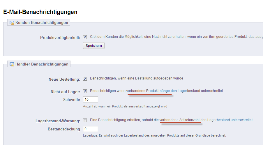 Pronux Posted October 24, 2013 Share Posted October 24, 2013 In meinem PrestaShop 1.5.6 wird die einfache Lagerverwaltung (also eben nicht die erweiterte Lagerverwaltung) genutzt. So wie ich es verstehe, entspricht die unter Katalog > Produkte > Menge definierte Menge somit immer auch dem Lagerbestand im Shop. Wenn dies so korrekt ist, entsprechen "vorhandene Produktmänge" und "vorhandene Artikelanzahl" dann auch immer dem Lagerbestand oder was genau sind die Unterschiede, vgl. Screenshot: Kennt jemand eine Seite/Thread wo die Konfiguration dieses Moduls erklärt wird? Bin für jeden Tipp / Erklärung dankbar. Link to comment Share on other sites More sharing options...