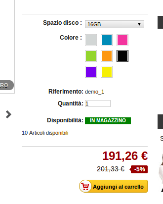 Prestashop 1.5.6.0, clean install, prodotti demo, referenza in bella vista con 10 prodotti disponibili.