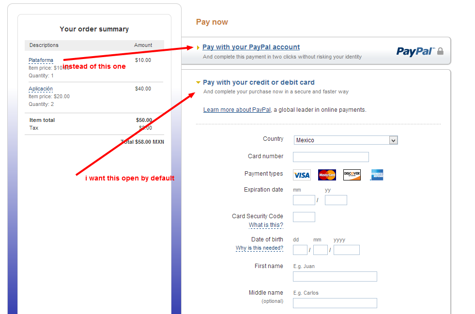 bellini13 Posted October 30, 2013 Share Posted October 30, 2013 http://stackoverflow.com/questions/16755125/paypal-payments-default-to-pay-with-credit-card-instead-of-loggin-in-with-a-p Link to comment Share on other sites More sharing options...