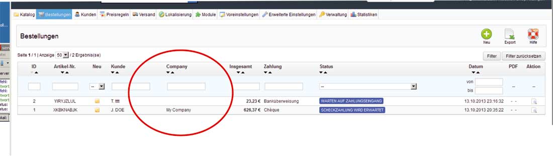 Wahrscheinlich sitzt der Bug vor dem Rechner und nicht in der Software, aber ich finde einfach keine Möglichkeit, mir im BO bei Version 1.5.5.0 die Firmennamen zu den Kunden anzeigen zu lassen, selbst bei John Doe steht weder bei der Kundenübersicht noch bei den Adressen der Name der Firma. Dann kann ich bei einer neuen Bestellung nicht danach suchen.