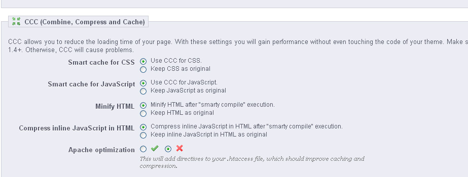At this moment i have the Apache optimization set to enabled and Use cache is disabled for me, also i have the Smarty cache disabled too since i have received a warning from my hosting company that my website has eat up all my disk space :(