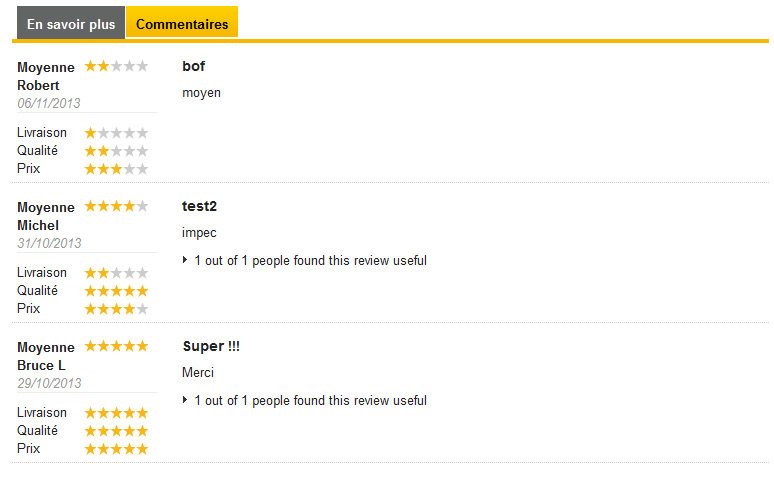 indesign47 Posted November 6, 2013 Share Posted November 6, 2013 Bonjour Switchboad, Ce que tu souhaites implémenter est le lien pour la modération ? Oui, un lien, dans l'email envoyé, vers le module product comments pour valider ou supprimer le nouveau commentaire. Chez moi, lorsque le produit contient plusieurs commentaires, il n'y a pas d'erreur. Merci, je vais regarder cela de plus près. Je rajoute la capture Lorsque le produit contient plusieurs commentaires, la note du dernier critère n'est pas bonne. Commentaire : 2 Note moyenne : 2 Quality : 2 Prix : 2 (il affiche 0) Link to comment Share on other sites More sharing options...