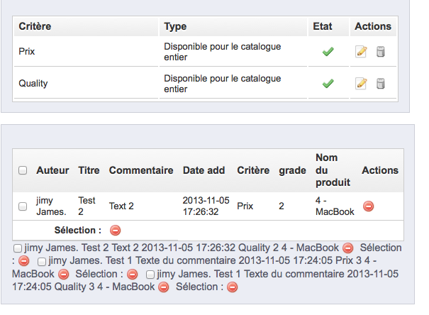 Superbegood31 Posted May 15, 2014 Author Share Posted May 15, 2014 Bonjour à tous, Je suis en pleine préparation de migration vers PS 1.6 et la modification apportée fonctionne en partie... Un bug s'est glissé au niveau des différentes notes... O peut voir sur l'image que les différentes notes ne sont correctes... Si vous avez des idées, je suis preneur. Merci à tous PS : Dès que j'aurai réglé le problème je posterai le zip pour PS 1.6 Link to comment Share on other sites More sharing options...