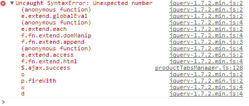 banel Posted November 5, 2013 Author Share Posted November 5, 2013 Hello, This is the error in Chrome console: Uncaught SyntaxError: Unexpected number jquery-1.7.2.min.js:2 (anonymous function)jquery-1.7.2.min.js:2 e.extend.globalEvaljquery-1.7.2.min.js:2 (anonymous function)jquery-1.7.2.min.js:4 e.extend.eachjquery-1.7.2.min.js:2 f.fn.extend.domManipjquery-1.7.2.min.js:4 f.fn.extend.appendjquery-1.7.2.min.js:3 (anonymous function)jquery-1.7.2.min.js:4 e.extend.accessjquery-1.7.2.min.js:2 f.fn.extend.htmljquery-1.7.2.min.js:4 $.ajax.successproductTabsManager.js:128 ojquery-1.7.2.min.js:2 p.fireWithjquery-1.7.2.min.js:2 wjquery-1.7.2.min.js:4 d Link to comment Share on other sites More sharing options...