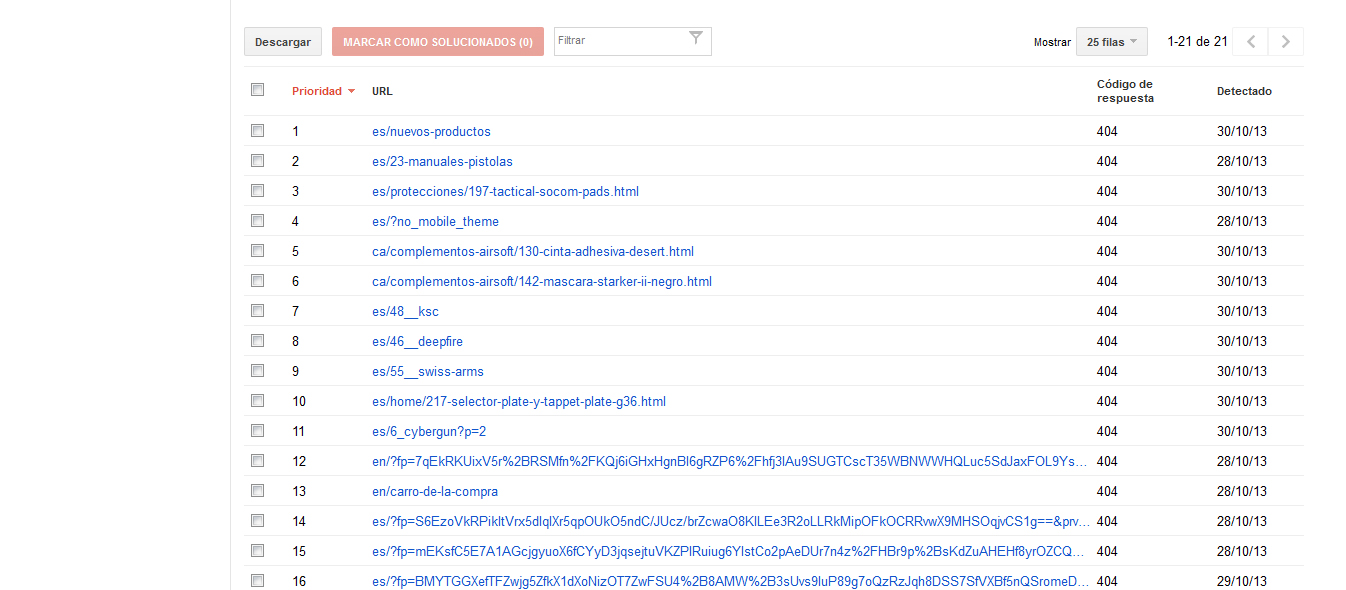 fdfran Posted November 1, 2013 Share Posted November 1, 2013 (edited) Hola tengo una duda.Como sabeis se pueden añadir y quitar tantos idiomas como se deseen. Hubo un momento que dejé español e inglés, pero viendo que no tengo tiempo para hacer la traducción a inglés, eliminé el inglés. E hice para que cuando google llegue a mi web a través de un sufijo /es/ redirija bien. Hasta aquí todo correcto. Seguí las instrucciones de este post http://www.prestashop.com/forums/topic/251581-aporte-redireccion-pagina-no-encuentra-error-404-al-quitar-desinstalar-un-idioma/Sin embargo,en Webmaster tools cuando entro me siguen apareciendo páginas de error provocadas porque no encuentra las páginas con las terminaciones /es/. Me dice que las descripciones y los títulos están duplicadas.En algunas hasta me sigue saliendo hasta el catalán que lo quite al poco de instalar. Cuando pincho en esos enlaces evidentemetne me da error. Mi web es http://www.airsoftworldgame.comAdjunto una imagen. Edited November 11, 2013 by fdfran (see edit history) Link to comment Share on other sites More sharing options...