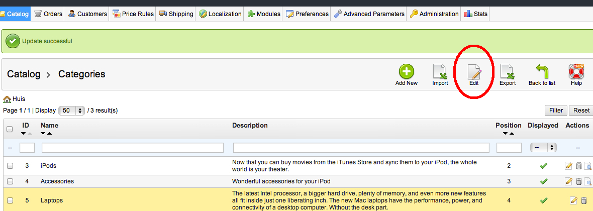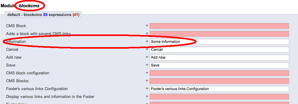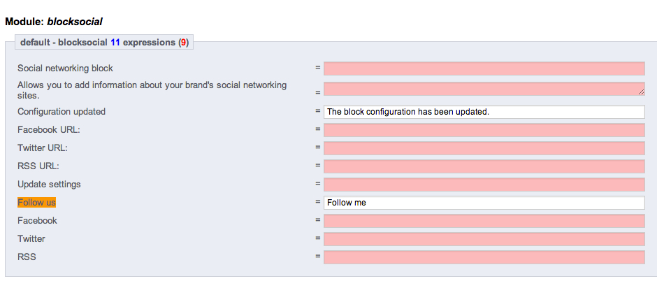 PascalVG Posted November 2, 2013 Share Posted November 2, 2013 Hi, Follow us: Localization->Translations, Installed Modules Translations/Your theme/Your language flag Search for Follow us (Ctrl-F) or scroll down to BlockSocial translation block Trranslate and Save. Reload front page (Ctrle-F5) to see result INFORMATION: Same file, search for blockcms translation block: Home: Go to Catalog->Categories. Directly click on the Edit Button Translate and save. Reload front page (Ctrle-F5) to see result That should do it, pascal Link to comment Share on other sites More sharing options...
