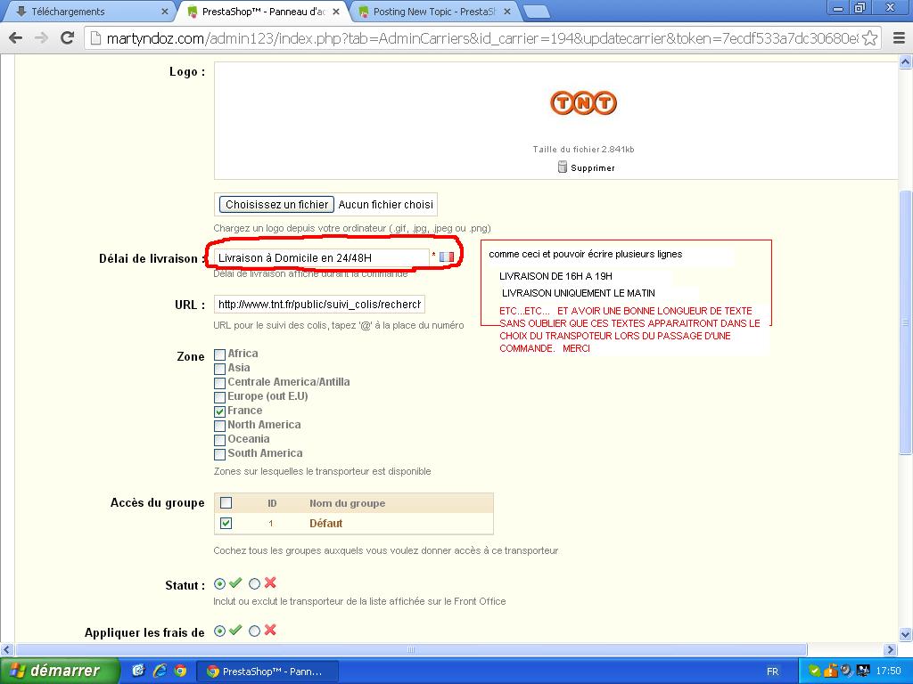 Une petite aide serait la bienvenue si possible, en faite, je souhaiterai augmenter en taille la zone:"délai de livraison" dans BO transporteurs et pouvoir aussi forcément mettre du libellé libre sur 3 ou 4 lignes une en dessous de l'autre. voir exemple pièce jointe,   prestashop 1.4.9.0.