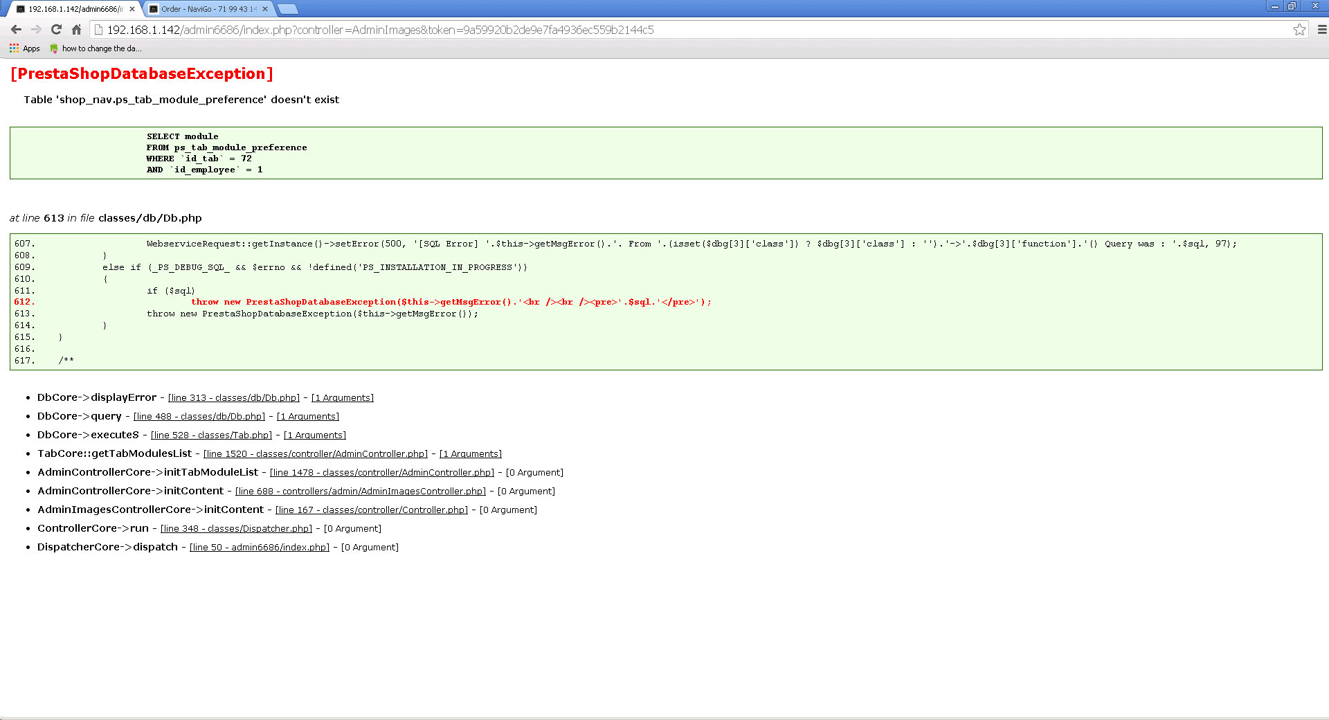 way3000 Posted November 3, 2013 Share Posted November 3, 2013 (edited) http://pastebin.com/dwaTSZdHAnyone know what causes this error?Clean install of 1.5.5.0 imported old database (from 1.5.4.0) installed updatet theme for 1.5.5.0got problems with images, but from here on I am blank. Full error: [PrestaShopDatabaseException] Table 'shop_nav.ps_tab_module_preference' doesn't exist SELECT module FROM ps_tab_module_preference WHERE `id_tab` = 72 AND `id_employee` = 1 at line 613 in file classes/db/Db.php 607. WebserviceRequest::getInstance()->setError(500, ' '.$this->getMsgError().'. From '.(isset($dbg[3]['class']) ? $dbg[3]['class'] : '').'->'.$dbg[3]['function'].'() Query was : '.$sql, 97); 608. } 609. else if (_PS_DEBUG_SQL_ && $errno && !defined('PS_INSTALLATION_IN_PROGRESS')) 610. { 611. if ($sql) 612. throw new PrestaShopDatabaseException($this->getMsgError().'<br /><br /><pre>'.$sql.'</pre>'); 613. throw new PrestaShopDatabaseException($this->getMsgError()); 614. } 615. } 616. 617. /** DbCore->displayError - [line 313 - classes/db/Db.php] - [1 Arguments] DbCore->query - [line 488 - classes/db/Db.php] - [1 Arguments] DbCore->executeS - [line 528 - classes/Tab.php] - [1 Arguments] TabCore::getTabModulesList - [line 1520 - classes/controller/AdminController.php] - [1 Arguments] AdminControllerCore->initTabModuleList - [line 1478 - classes/controller/AdminController.php] - [0 Argument] AdminControllerCore->initContent - [line 688 - controllers/admin/AdminImagesController.php] - [0 Argument] AdminImagesControllerCore->initContent - [line 167 - classes/controller/Controller.php] - [0 Argument] ControllerCore->run - [line 348 - classes/Dispatcher.php] - [0 Argument] DispatcherCore->dispatch - [line 50 - admin6686/index.php] - [0 Argument] Edited November 4, 2013 by way3000 (see edit history) Link to comment Share on other sites More sharing options...