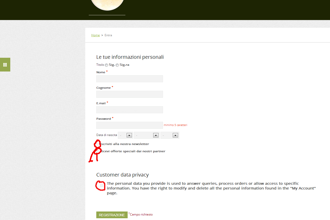 neasoluzioni77 Posted November 4, 2013 Share Posted November 4, 2013 Salve, in fase di autenticazione il mio prestashop ha un grosso problema. Le finistrelle Newsletter, offerte speciali e privacy non sono flaggabili è come se fossero delle semplici immagini. Qualcuno di voi può aiutarmi? Le ho provate tutte allego foto. Vincenzo Link to comment Share on other sites More sharing options...