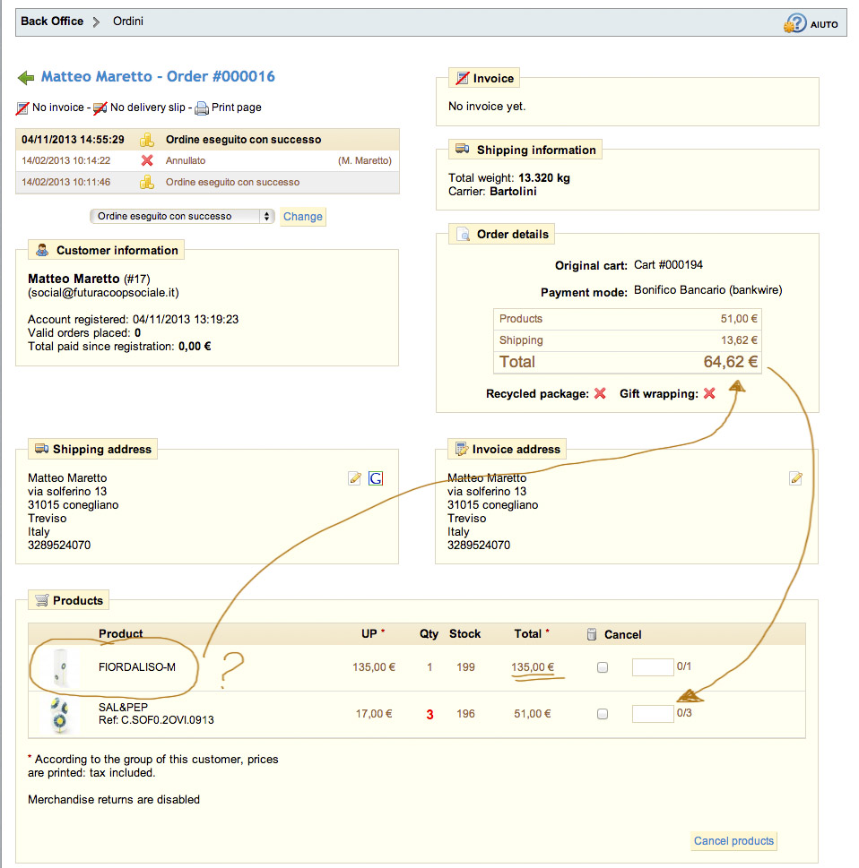 matemare Posted November 4, 2013 Share Posted November 4, 2013 Salve a tutti ho un problema con Prestashop. Mi loggo faccio un acquisto e sul B.O. alla voce dettagli ordine trovo un oggetto aggiunto da prestashop che non è stato aggiunto precedentemente nel carrello (non ho idea da dove lo pigli). La cosa strana è che non và ad influire sul prezzo finale ma cmq me lo trovo in lista sulla fattura generata ma non sulla mail che viene mandata al cliente. Inoltre se provo a eliminare tale prodotto la piattaforma mi ritorna questo errore:Fatal error (Order -> total_products_wt = -84.00)ricarico la pagina ed il prodotto sparisce. Vi prego aiutatemi! Grazie Link to comment Share on other sites More sharing options...