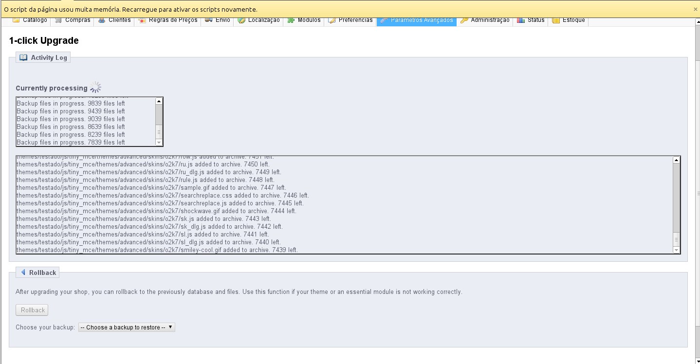flipe Posted November 5, 2013 Share Posted November 5, 2013 (edited) Tenho a versão 1.5.3.1 e estou tentando atualizar para a versão 1.5.6, instalei o módulo 1-click Upgrade, pedi para atualizar e ele fechou dizendo que havia usado muita memória ou algo do gênero, e agora ele não atualiza mais, fica carregando indefinidamente não se sabe o que, já tentei desativar e ativar novamente o módulo mas não muda, como resolver essa aí!? Sempre quando chega nessa parte aí, faltando 7439 arquivos, ele envia essa mensagem! Edited November 5, 2013 by flipe (see edit history) Link to comment Share on other sites More sharing options...