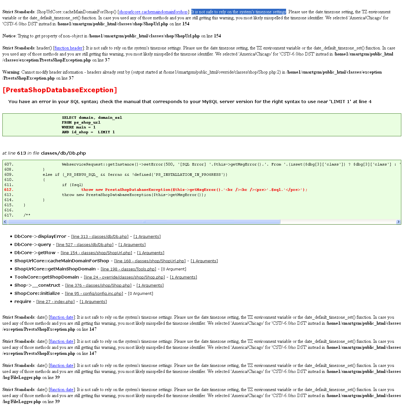 johnme Posted November 5, 2013 Share Posted November 5, 2013 (edited) now i am in trouble I just uninstall and try to install google sitemap . than start having this error Strict Standards: ShopUrlCore::cacheMainDomainForShop() [shopurlcore.cachemaindomainforshop]: It is not safe to rely on the system's timezone settings. Please use the date.timezone setting, the TZ environment variable or the date_default_timezone_set() function. In case you used any of those methods and you are still getting this warning, you most likely misspelled the timezone identifier. We selected 'America/Chicago' for 'CST/-6.0/no DST' instead in /home1/mydomain/public_html/classes/shop/ShopUrl.php on line 154Notice: Trying to get property of non-object in /home1/mydomain/public_html/classes/shop/ShopUrl.php on line 154Strict Standards: header() [function.header]: It is not safe to rely on the system's timezone settings. Please use the date.timezone setting, the TZ environment variable or the date_default_timezone_set() function. In case you used any of those methods and you are still getting this warning, you most likely misspelled the timezone identifier. We selected 'America/Chicago' for 'CST/-6.0/no DST' instead in /home1/mydomain/public_html/classes/exception/PrestaShopException.php on line 37Warning: Cannot modify header information - headers already sent by (output started at /home1/mydomain/public_html/override/classes/shop/Shop.php:2) in /home1/smartgsm/public_html/classes/exception/PrestaShopException.php on line 37 [PrestaShopDatabaseException] You have an error in your SQL syntax; check the manual that corresponds to your MySQL server version for the right syntax to use near 'LIMIT 1' at line 4 Edited November 5, 2013 by johnme (see edit history) Link to comment Share on other sites More sharing options...