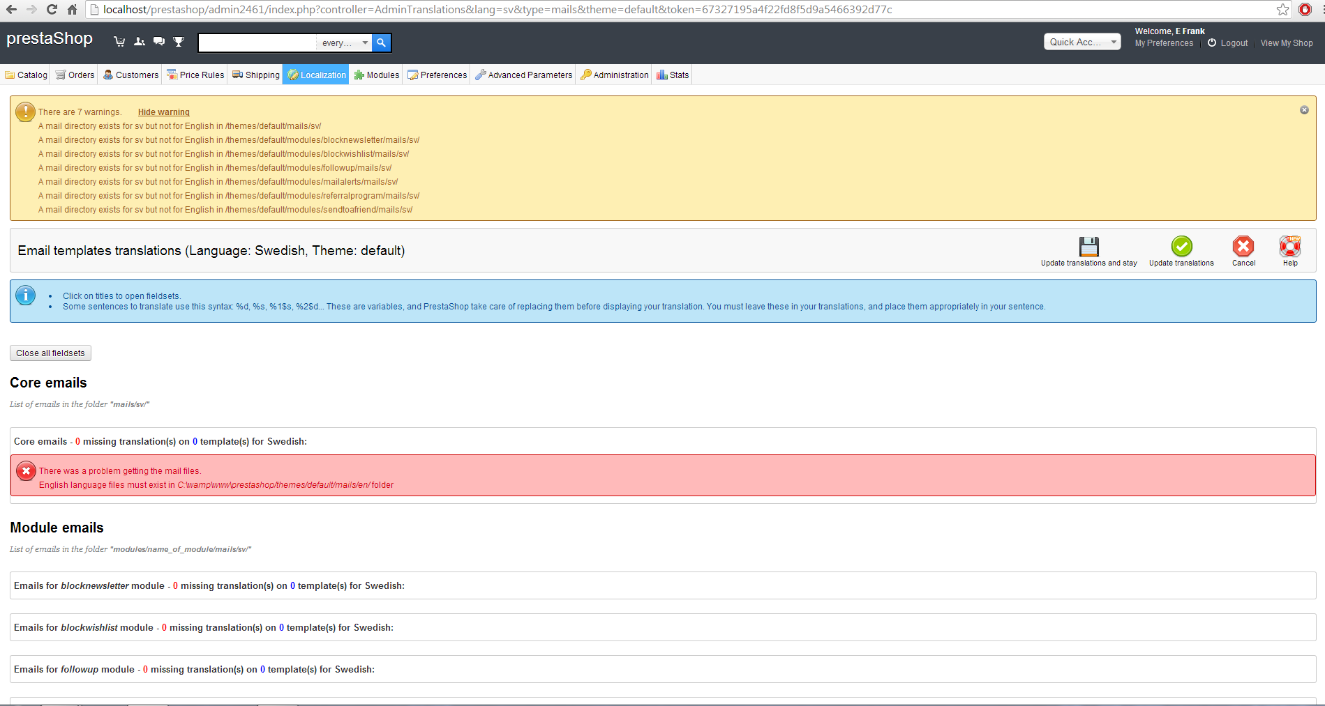 Tachiibou Posted November 5, 2013 Share Posted November 5, 2013 (edited) Hi! I have tried to change the "email template translation" in Localization -> Translations. And when i update, all the translations for that language (in email template) disappear and i get errors. I installed more languages and tried to update them and I get the same error, all the translations disappear. Even if I dont change anything in the translations, when i click the "update translations" button the next time i check, all the translations are gone for that language. I have tried to update the language packs but it does not fix the problem. But when i look in the folder mails/sv, all the translations are there but prestashop cant find them Im using prestashop 1.5.6.0. Attaching an image showing the errors i get. Please help! Edit: I am running this test prestashop on my computer but i have the same problem on my real webshop, this is just for testing so i dont destroy the real one. Edited November 6, 2013 by vekia (see edit history) Link to comment Share on other sites More sharing options...