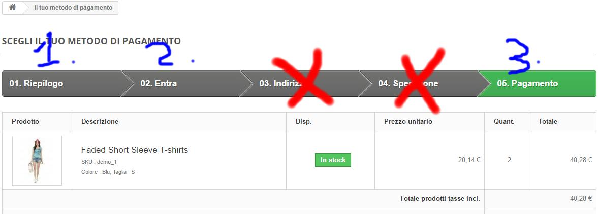 In ogni caso temo siano necessarie modifiche sul codice, PS aspetta i dati di questo passo per riempire il database e di conseguenza tutto il resto (fatture, statistiche, ecc ecc). Se si saltano i passi del checkout questi dati andranno comunque inviati e registrati. Ma non capisco quali, se salti i passi. Uno non può avere indirizzo di spedizione e fatturazione differenti?
