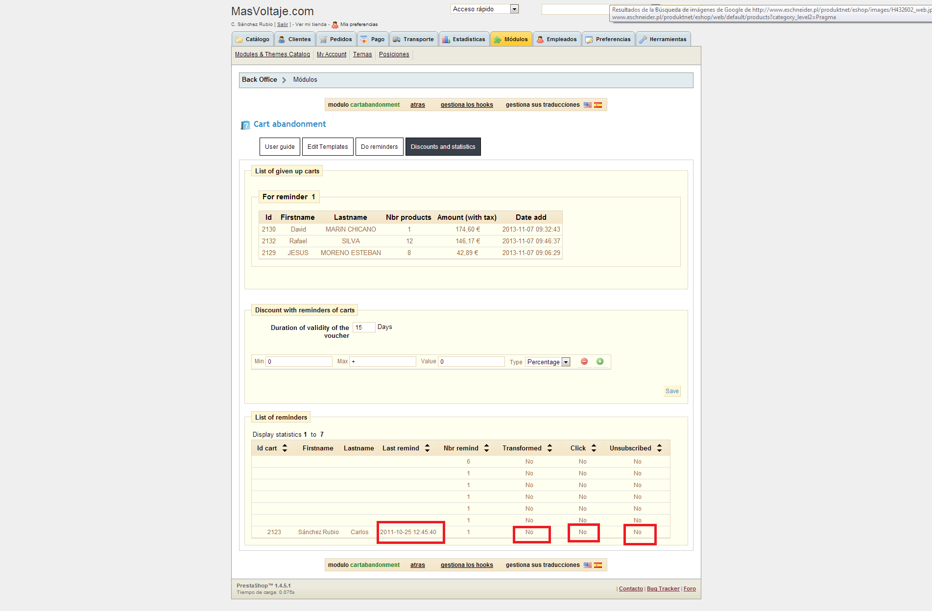riderlol Posted November 7, 2013 Share Posted November 7, 2013 Buenos días, recientemente he comprado el modulo abandoned cart reminder y tengo varios problemas. El primer problema es que la fecha del ultimo recordatorio es incorrecta, informa de que el ultimo fue en el año 2011 y estamos en 2013, la hora del sistema linux y fecha esta puesta correctamente. El segundo problema es que no registra los clicks en el email ni las conversiones. El tercer problema es que no guarda el tiempo de espera para el primer email, cuando se ejecuta la tarea de cron se envian siempre todos los emails pendientes. Desde el minuto 1 ya se envia el primer email si la tarea de cron se ejecuta. El cuarto problema es que en los emails aparece una franja de color rosa que no he conseguido eliminar de ninguna manera de y que no es problema de mi plantilla. Adjunto varias imagenes a fin de que puedan hecharme una mano. un saludo Saludo. Link to comment Share on other sites More sharing options...