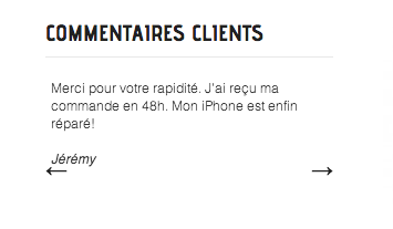 WebDesign-Entreprise Posted November 7, 2013 Share Posted November 7, 2013 (edited) Commentaires clients Description Ce module vous permet d'afficher des commentaires clients dans les colonnes de gauche ou de droite. Vous pouvez ajouter les commentaires directement par le back-office. Ce module est Responsive, il s'adapte à votre site quelque soit la largeur de vos colonnes. Ce module est très utile pour afficher par exemple vos évaluations eBay. Installation - Mettez le dossier customercomments dans votre dossier modules. - Allez dans la partie Administration de votre site et sélectionner l'onglet modules. - Ouvrez maintenant l'onglet "Marketing et publicité" et lancez l'installation du module. - Dernière étape, allez dans la partie configuration de ce module pour ajouter vos commentaires et avis clients. Demo Ce module est en démonstration sur ces deux sites: Pieces2iPhone i-Sticker Captures Fichiers customercomments.zip Edited November 7, 2013 by i-Sticker (see edit history) 3 1 Link to comment Share on other sites More sharing options...