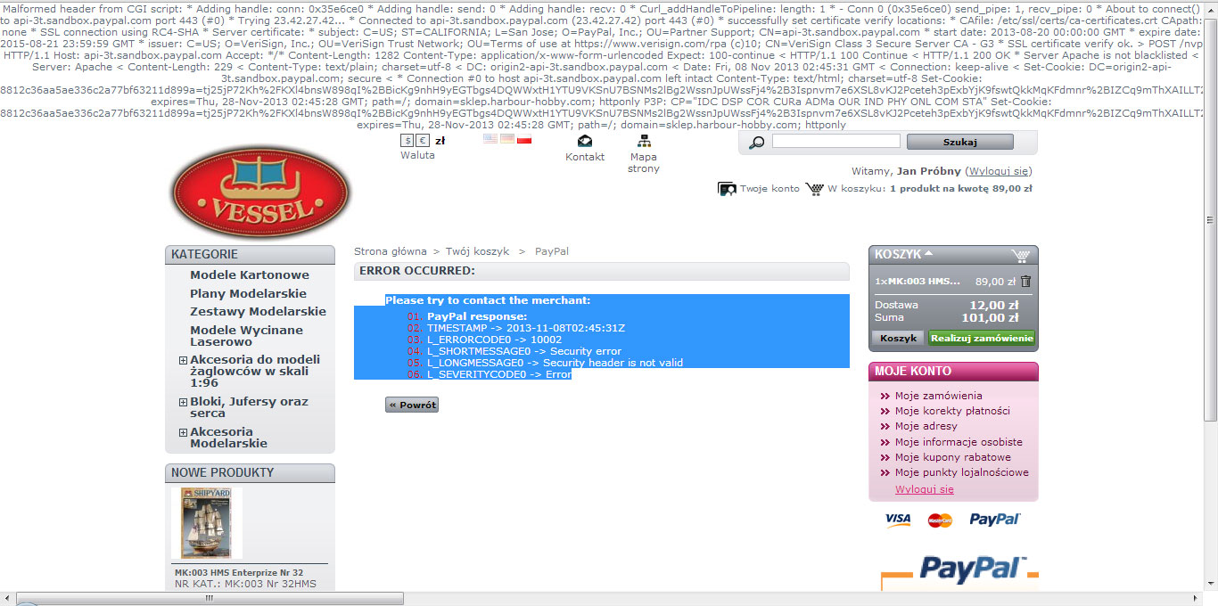 Tomekpoz Posted November 8, 2013 Share Posted November 8, 2013 Witam Mam problem z modułem PayPal podczas kroku płatności wyświetla się błąd: Please try to contact the merchant: PayPal response: TIMESTAMP -> 2013-11-08T02:45:31Z L_ERRORCODE0 -> 10002 L_SHORTMESSAGE0 -> Security error L_LONGMESSAGE0 -> Security header is not valid L_SEVERITYCODE0 -> ErrorW załączniku screen Będę wdzięczny za pomoc Link to comment Share on other sites More sharing options...