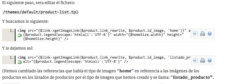 nadie Posted November 9, 2013 Share Posted November 9, 2013 Ya te he dicho lo que tienes que hacer, aquí: http://www.prestashop.com/forums/topic/287637-cambiar-tama%C3%B1o-de-im%C3%A1genes-y-columnas/?view=findpost&p=1450177 te he dicho como tienes que dejar el product_list.css y product-list.tpl Y aquí: http://www.prestashop.com/forums/topic/287637-cambiar-tama%C3%B1o-de-im%C3%A1genes-y-columnas/?view=findpost&p=1450184 las modificaciones sobre los nuevos ficheros product_list.css y product-list.tpl que has colocado en referencia al post que te he comentado: http://www.prestashop.com/forums/topic/287637-cambiar-tama%C3%B1o-de-im%C3%A1genes-y-columnas/?view=findpost&p=1450177 Simplemente cuando hagas los cambios, limpia la cache de tu navegador, y fuerza compilación en la pestaña Parametros Avanzados > Rendimiento Link to comment Share on other sites More sharing options...