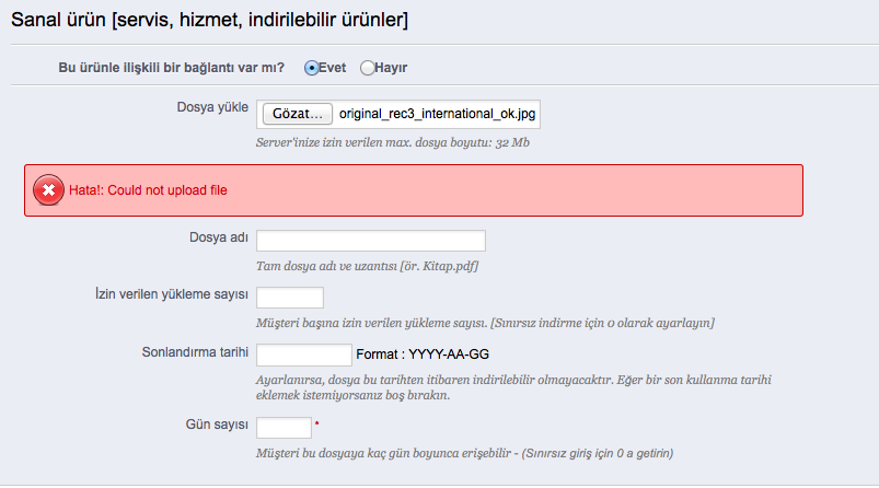 tasarimci Posted November 9, 2013 Share Posted November 9, 2013 Merhaba, PrestaShop™ 1.5.6.0 ile sadece indirilebilir ürün satışı yapmak istiyorum. Ancak ürünleriminin kimi 5mb, kimi ise 500mb. a kadar çıkıyor. Ancak yazılım 'Server'inize izin verilen max. dosya boyutu: 32 Mb' demesine rağmen 5mb. üzerindeki dosyaları iklememe izin vermiyor ve 'Hata!: Could not upload file' hata mesajını veriyor. Bu hata mesajı neden geliyor ve yükleme boyutu ihtiyacım olan boyuta nasıl çıkarabilirim. Herkese yardımları için şimdiden teşekkür ederim. Link to comment Share on other sites More sharing options...