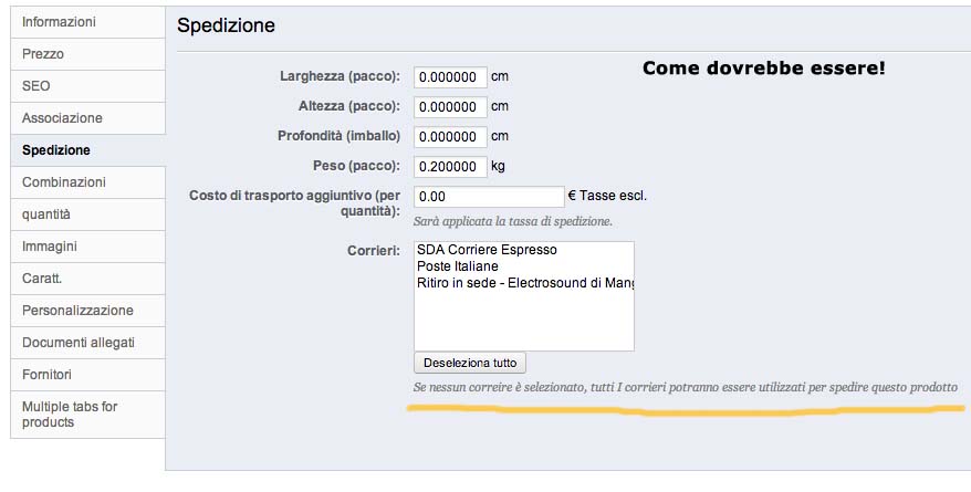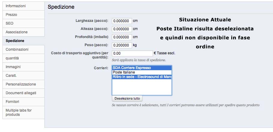 Ciao a tutti! Piccolo problemuccio, speriamo qualcuno mi possa aiutare a risolvere. Ho da poco aggiunto posta prioritaria come corriere, ovviamente (vedi "immagine1" ) risulta deselezionata come scelta di corriere per quel prodotto. Io vorrei deselezionare (vedi "immagine2") su tutte le schede  dei mie 1200 prodotti i corrieri, in modo tale che possano essere tutti disponibili in fase di acquisto. Allego i file immagine. Spero di essere stato chiaro. Grazie.
