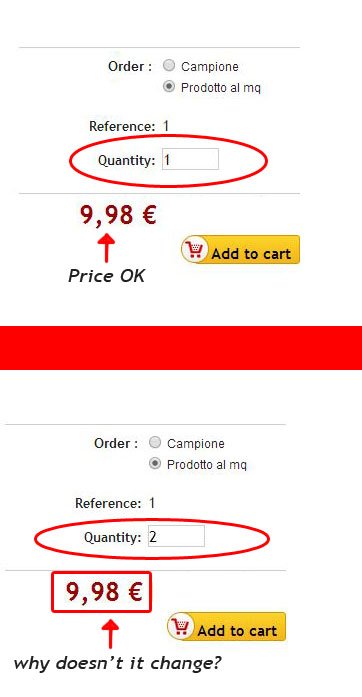 faxlain Posted November 9, 2013 Share Posted November 9, 2013 (edited) Hi masters, I'm PrestaShop Newbie and I'm not english, so excuse me If I will not be able to choose the best way to explain my problem... In product page I would like to show total price of a product, according to the quantity set by the user. Untill now, instead, total price doesn't change in real time if I modify quantity value in product page and I don't understand if it is normal or not... I hope I've been clear... anyhow I attach file of my problem Sorry for my english and thanks in advance. (I have 1.5.6.0 version of Prestashop) Edited November 9, 2013 by faxlain (see edit history) Link to comment Share on other sites More sharing options...