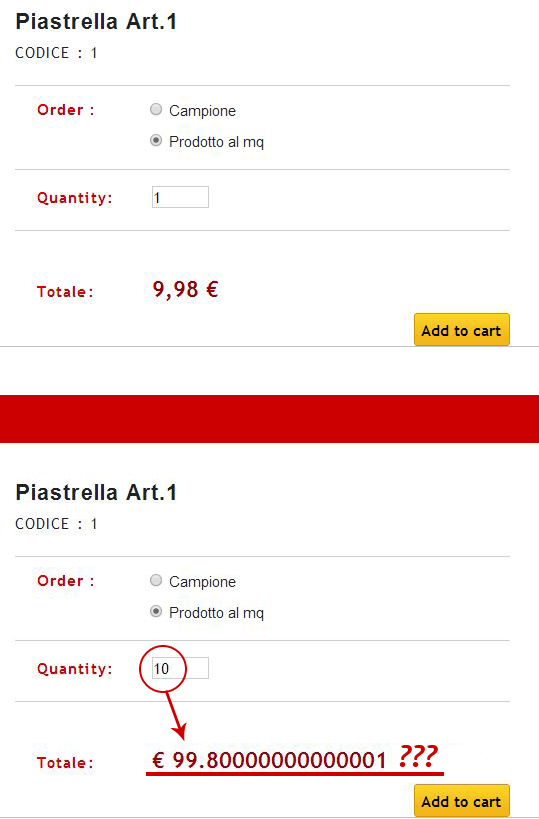 faxlain Posted November 12, 2013 Author Share Posted November 12, 2013 (edited) ...This problem is becoming more and more strange... I've noted another unusual thing: in some case (and apparently in an illogical way) the total price shows a lot of decimal numbers, although there would be no need. I attach file of this new problem (img. top is ok; img. down is sadly ko): Master, what do you think about this? Is it a bug of PS? p.s. I suspect you are starting to hate me... Edited November 12, 2013 by faxlain (see edit history) Link to comment Share on other sites More sharing options...