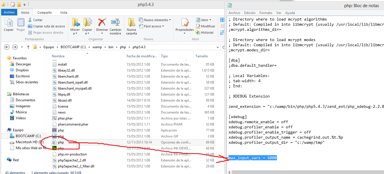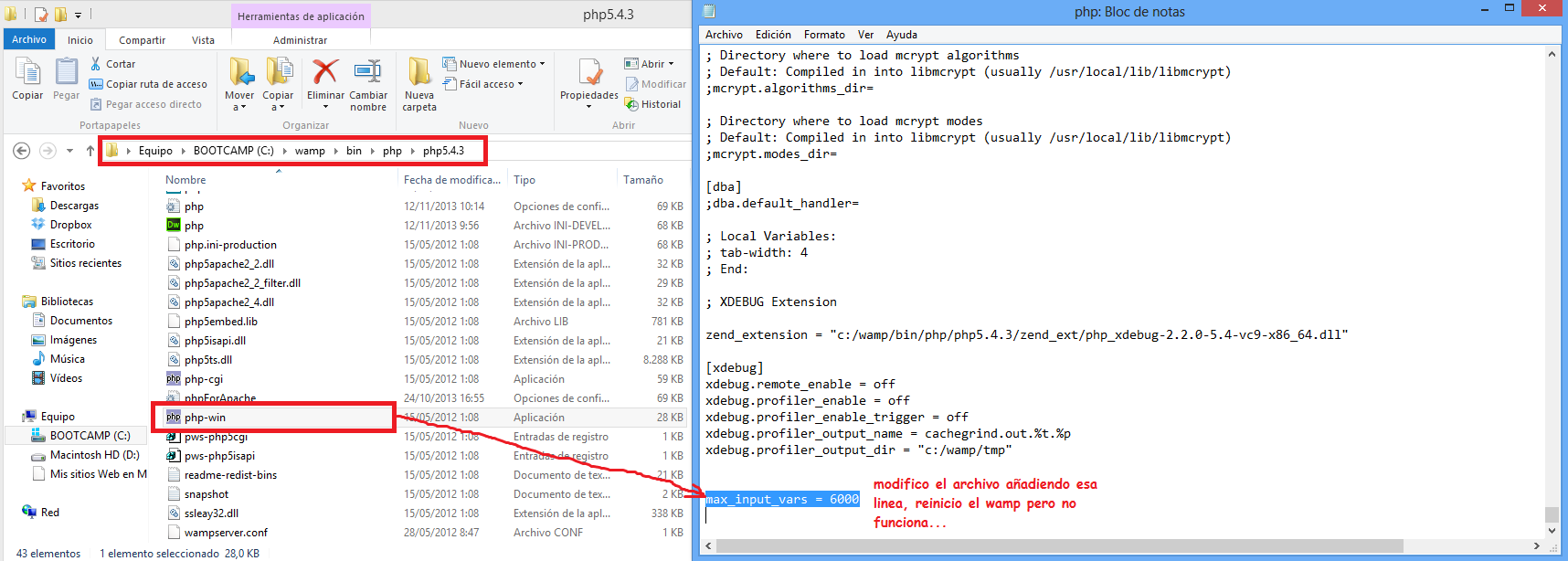 BorjaJA Posted November 12, 2013 Share Posted November 12, 2013 (edited) Me aparece el siguiente error: ¡Advertencia! La configuración de PHP limita el número máximo de campos para enviar en un formulario: 1000 = max_input_vars.Por favor solicite a su proveedor de hosting que aumente el límite a: 1438 o edite el archivo de traducción de forma manual. He hecho todo lo que se dice en otras noticias del foro pero me ha sido imposible y por eso escribo... Adjunto la imagen para aclarar el archivo que modifico y su localización Estoy utilizando wamp, y no lo tengo subido al hosting de momento, por lo que estoy trabajando en localhost... He reiniciado wamp despues de hacer modificaciones, y he probado mil formas.... Espero que me puedan ayudar!! Muchas gracias!! Edito: perdon por la foto, el archivo que modifico no es ese, es el php.ini que esta dentro de esa misma carpetaa!! si quieren vuelvo a subir la foto corregida Edited November 12, 2013 by BorjaJusdado (see edit history) Link to comment Share on other sites More sharing options...