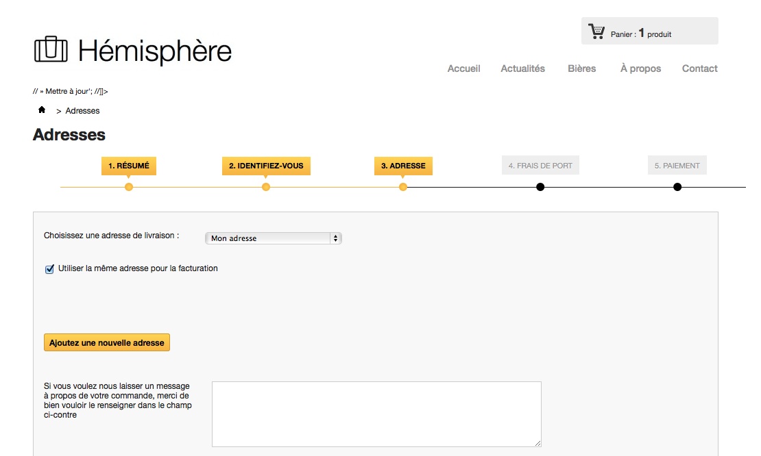 brasseur Posted November 12, 2013 Share Posted November 12, 2013 Hi everyone, As you can see on the enclosed file, I am having an issue with the breadcrumb. When I am in the cart steps, it shows " // » Mettre à jour'; //]]> " in identification, address, and delivery - but not in summary. "Mettre à jour" means "Update". Do you have any idea where this is coming from? Here is where it happens, when you want to checkout delivery : http://www.brasserie-hemisphere.com/boutique/index.php?controller=order&step=0 Thanks a lot for your help, Link to comment Share on other sites More sharing options...