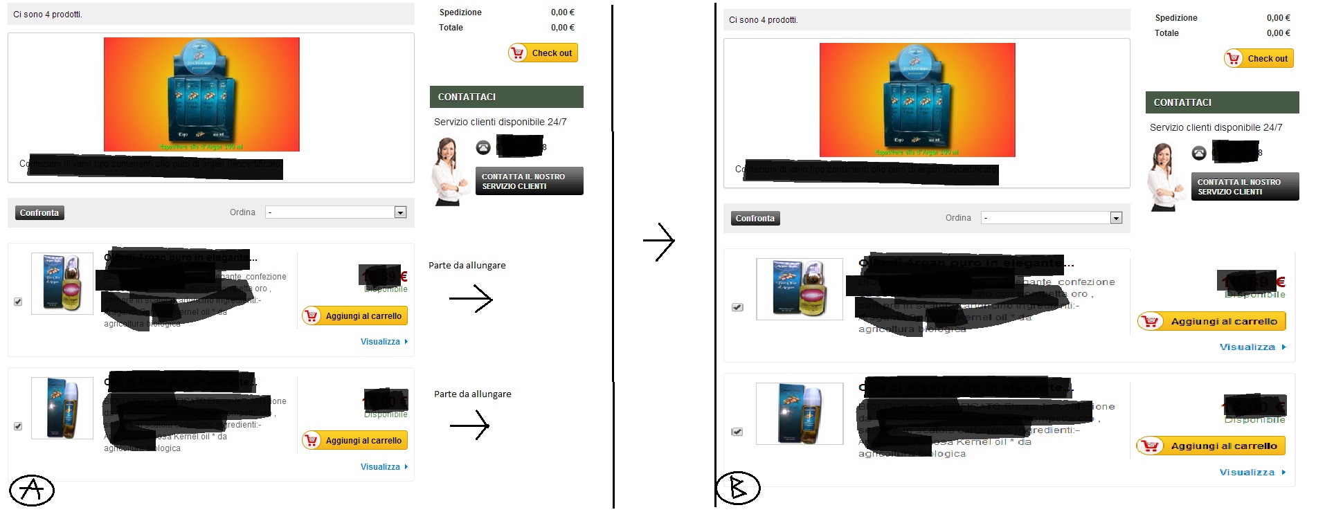 shinnokdrako Posted November 12, 2013 Share Posted November 12, 2013 Salve a tutti, rieccomi qui nuovamente con un dilemma: come modificare una parte della pagina (di una categoria) senza rovinare il resto? Ho fatto alcune prove con risultati pessimi, ora mi inginocchio in cerca di aiuto. Ho fatto uno screeshot che mostra cosa vorrei fare. Parte (A): layout attuale, dopo aver cliccato il link di una categoria (una qualsiasi). Il riquadro dei prodotti, con descrizione ecc, arriva a riempire la sua parte centrale, in quanto il tema è "default" (prestashop 1.5.6) diviso in 3 colonne. Vorrei che il riquadro del prodotto invece arrivasse oltre al suo "alloggiamento" della colonna centrale e con il bordo arrivasse alla fine della colonna di destra. Ecco un'immagine indicativa: Parte (: questo è quello che vorrei ottenere, tenendo però tutto il resto (colonna di sinistra e parte sopra della colonna di destra fino alla fine del riquadro "Contattaci"). Spero di essermi spiegato bene e chiedo scusa per la pessima qualità dell'immagine ;P Grazie in anticipo. Link to comment Share on other sites More sharing options...