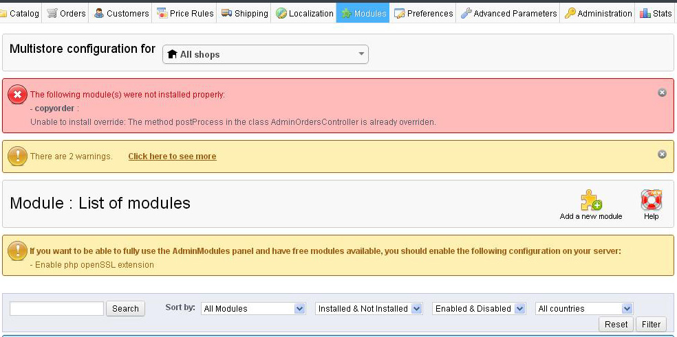 gowri Posted November 16, 2013 Author Share Posted November 16, 2013 (edited) Hi Vekia, Thanks for your reply.. the exact output we need is what you presented in your previous conversation. Now i'll explain in detail below, Module -1 : Path: localhost/testshop/modules/custommodule1/override/controllers/admin/AdminOrdersController.php In AdminOrdersController.php we are using the below code format in custommodule1. class AdminOrdersController extends AdminOrdersControllerCore { public function postProcess() { if (Tools::isSubmit('module_1_settings')){ // do something } } } First i have installed this customemodule1, So in the path, Path : localhost/testshop/override/controllers/admin/AdminOrderscontroller.php AdminOrdersController.php file get override with the below output class AdminOrdersController extends AdminOrdersControllerCore { public function postProcess() { if (Tools::isSubmit('module_1_settings')){ // do something } } } Module -2 : Path: localhost/testshop/modules/custommodule2/override/controllers/admin/AdminOrdersController.php In AdminOrdersController.php we are using the below code format in custommodule2. class AdminOrdersController extends AdminOrdersControllerCore { public function postProcess() { if (Tools::isSubmit('module_2_settings')){ // do something } } } While installing the second module, i get the error in Modules list page as below, "Unable to install Override : The Method postprocess() in the class AdminOrdersController is already overridden". the printscreen is attached below. Kindly check it. Please tell me the solution...Thanks in advance.. Edited November 16, 2013 by gowri (see edit history) Link to comment Share on other sites More sharing options...