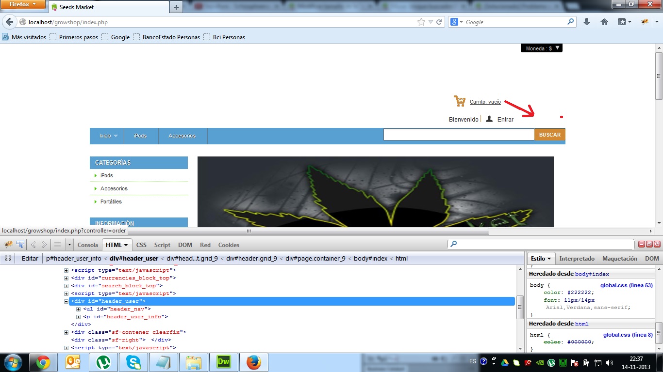 marduk88 Posted November 15, 2013 Share Posted November 15, 2013 (edited) Hola estoy modificando el theme por defecto prestashop 1.5.4, sin ser programador usando las ayuda del foro creo que e logrado bastante, pero me quede entrampado en bloque información usuarios. Necesito mover la parte del carrito a la derecha y dejarlo en horizontal, sobre el menu horizontal extremo derecho. bienvenido l Entrar + Carrito dejo un print de pantalla, si alguien amablemente me puede hechar un mano por fa Saludos Marco Edited November 17, 2013 by marduk88 (see edit history) Link to comment Share on other sites More sharing options...
