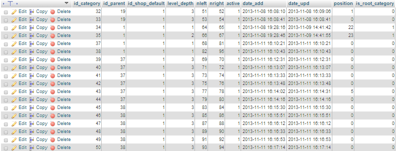 stottycabanas Posted November 17, 2013 Share Posted November 17, 2013 You have two categories (34 and 35) which have the column is_root_category set to 1 in the ps_category table. I don't know if these were attempts to replace the Home category (usually id_category = 2), but there are no other categories that have 34 or 35 as their parent category. Nor are there any other 'root' categories. Plus you have a load of categories with id_parent set to 1 - normally it's only the Home category, or other categories that are root categories, which would have a parent category of 1 (which is the category somewhat confusingly called Root). In short, your category structure has lost its integrity. I recommend you do a fresh install to a clean test environment, than look at the ps_category table via phpmyadmin to see how the structure is formed for the demo categories - the default layout, as you called it. Then, armed with that understanding, either update the database you have now, or restore the backup you took before the csv import and adjust the csv import process to get the desired results. Safer still, revert to your backup, forget the csv import and key the categories in one at a time via back office. It may cost you a couple of hours, but at least you won't be taking risks with your database. Cheers, Dave 1 Link to comment Share on other sites More sharing options...